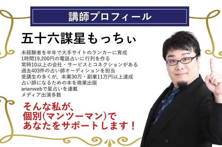 「五十六謀星アカデミー占い講座Online」は、占い師・講師の五十六謀星もっちぃが運営するオンライン講座です。